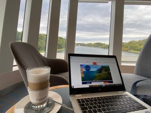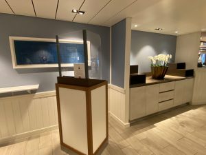 Am Schiff angekommen, begann bereits der hervorragende Service, wir konnten direkt die Koffer abgeben und es ging weiter ins Kreuzfahrt-Terminal. Mund-Nasenschutz anlegen, Hände desinfizieren, Temperatur-Messen und den Gesundheitsbogen – mit den Infos, in welchen Ländern/Bundesländern man sich in den letzten 14 Tagen aufgehalten hat – abgeben. Weiter ging’s zum Check-In. Hier wurde kurz ein Foto zur Verifizierung der Bordkarte beim Betreten und Verlassen des Schiffes gemacht und wir bekamen einen braunen Punkt auf die Bordkarte geklebt. Dies war die Zuordnung zur Zodiac-Gruppe, denn wir checkten ja für ein Expeditionsschiff ein, bei dem Anlandungen mit Zodiacs in jedem Reiseplan vorgesehen sind – so war das auch bei uns der Fall. Dazu aber später mehr. Es gab noch ein Einschiffungsfoto mit dem Schiff im Hintergrund und dann ging es auch schon – begleitet von einem Crew-Mitglied – und mit ganz vielen Informationen zum Tagesablauf auf dem Schiff – Richtung Kabine.