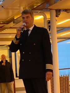 Dort gab es den obligatorischen Begrüßungs-Champagner und die Begrüßungsansprache vom Kapitän Axel Engeldrum und der Expeditions-Leiterin Anke Ulisch. Unser Kapitän stellte uns die Route und die Highlights vor und dann hieß es – nach einem kleinen Schiffsrundgang – auch schon „Leinen Los“ Richtung Wismar.