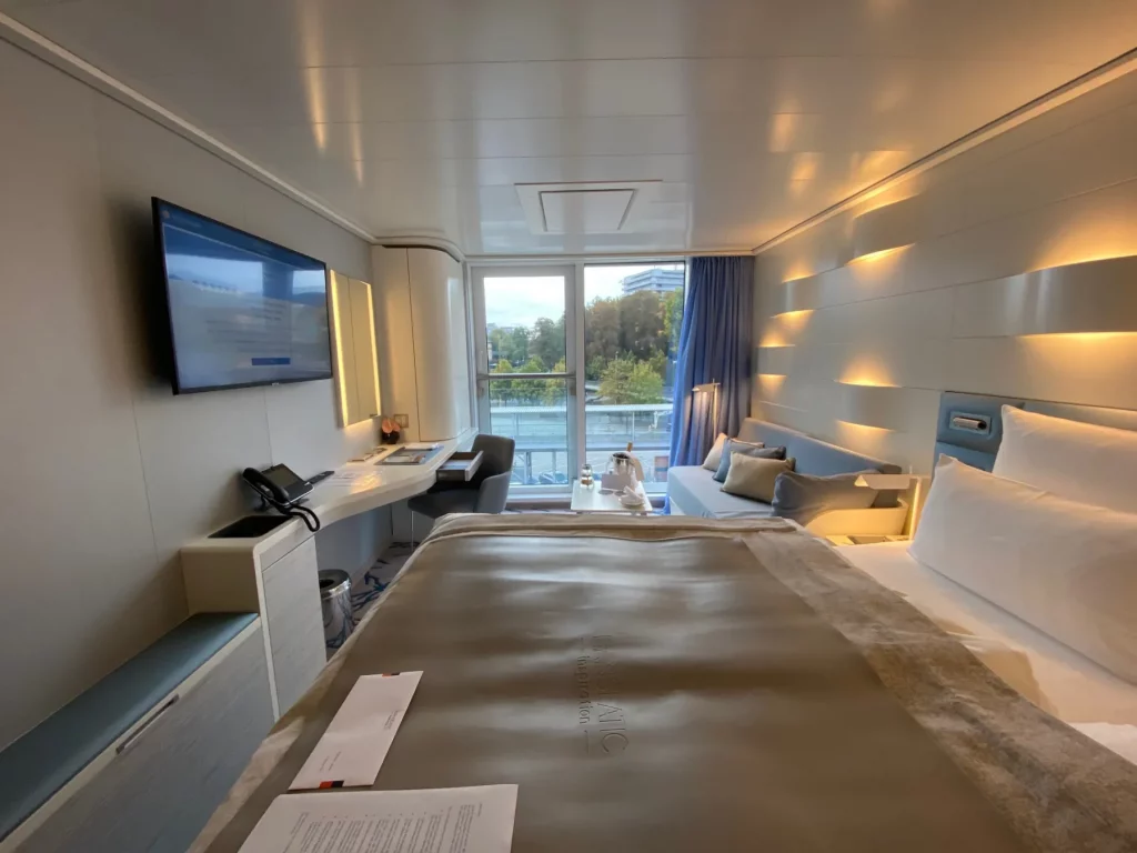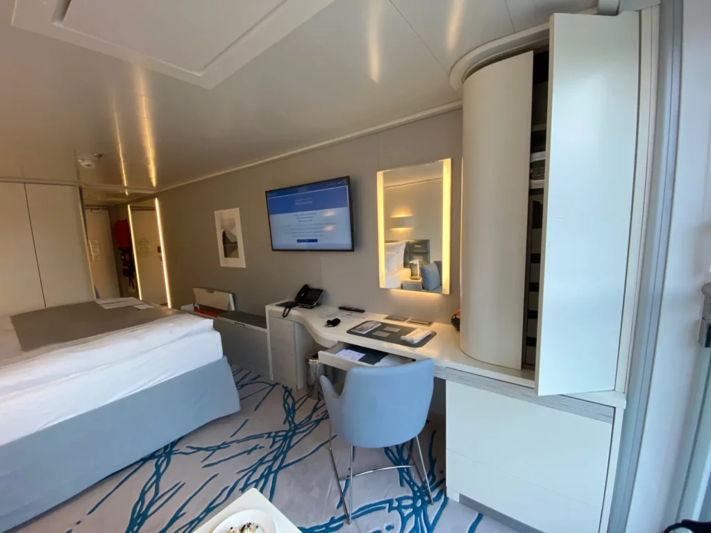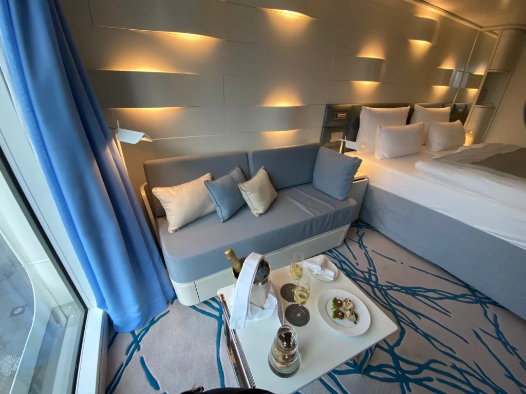 Unser Zuhause für die nächsten Tage sollte die auf Deck 7 gelegene Kabine 713 mit französischem Balkon und extrem viel Stauraum sein. Gerade auf der Kabine angekommen, bekamen wir direkt Besuch von unserer Kabinen-Stewardess, die uns ein Gläschen Champagner und ein paar Canapés „zum Ankommen“ servierte. Das war eine sehr gelungene Begrüßung und trug sofort dazu bei, dass wir uns heimisch fühlten.