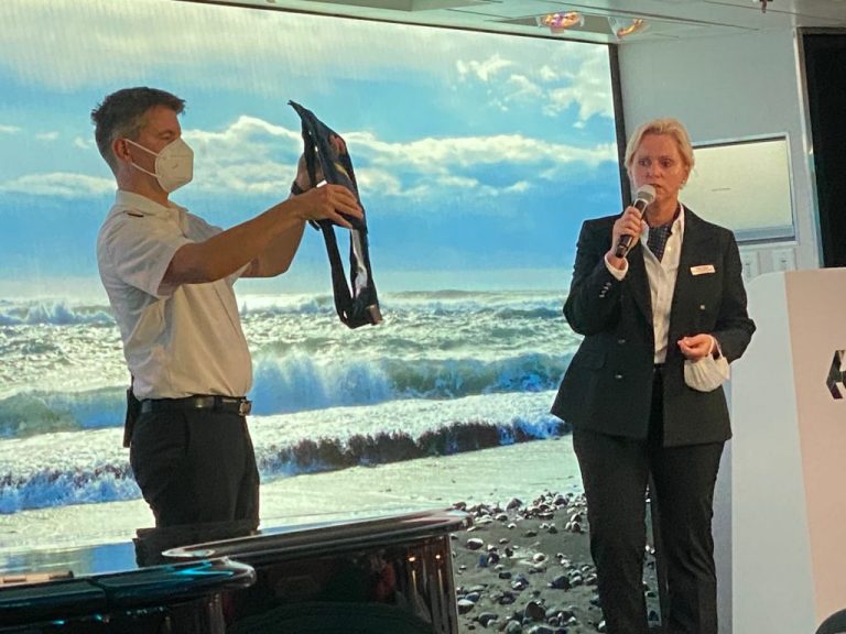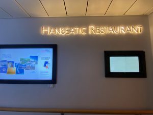 Es kam dann die einzige Pflichtübung jeder Kreuzfahrt – die Seenot-Rettungsübung. Normalerweise findet sie für alle Gäste im Hanseatrium statt, aber auch hier wurden die Gäste aufgeteilt auf das Hanseatrium und die Observation Lounge – dies geschah wieder nach den farbigen Punkten gemäß der Zodiac-Zuordnung. Unser Treffpunkt war das Hanseatrium – mit angelegten Rettungswesten. Auf dem Weg dorthin, wurde auf der Gästeliste unsere Anwesenheit markiert und wir suchten uns einen Platz – mit Abstand.