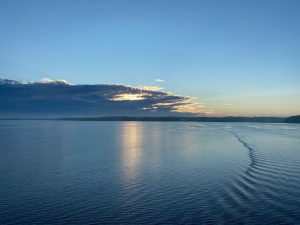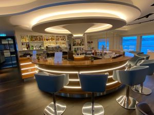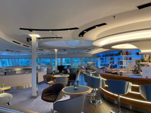 Nach dem Genuss des vorzüglichen Abendessens führte uns unser Weg nach draußen. Wer uns kennt, weiß, dass wir da am liebsten draußen sitzen – zur Not auch etwas wärmer angezogen, aber das war gar nicht nötig. Die Observation Lounge, die gleichzeitig auch die Bar für das Pool-Deck ist, hat auch einen recht geschützten Bereich, der gleichzeitig aber auch der Raucherbereich ist. Da wir doch schon etwas länger unterwegs waren, war es nur ein kurzer Schlummertrunk, um dann zur Kabine zu gehen und und bei Meeresrauschen einzuschlafen.