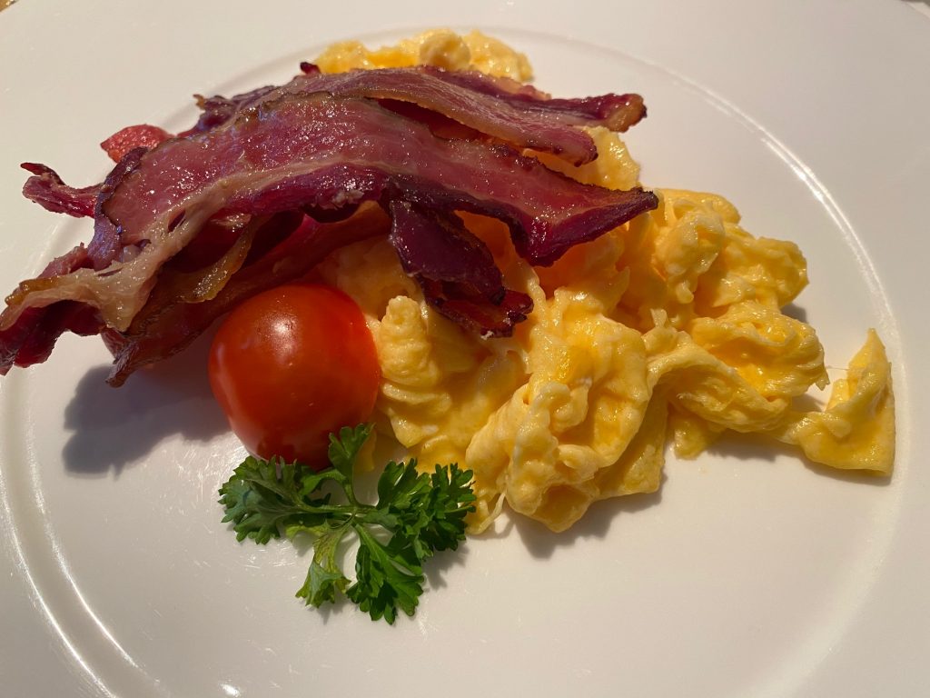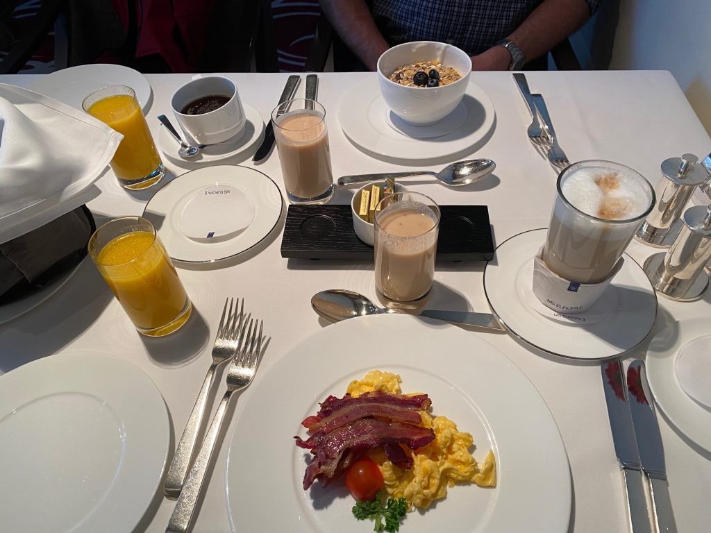 Als wir wach wurden, waren wir dann auch schon unterwegs, die Elbe abwärts Richtung Nordsee. Zum Frühstück verschlug es uns ins A LA CARTE-Restaurant WELTMEERE, denn unser Ziel war ja auch, ein paar Inspirationen für Euch zu sammeln. So hatten wir denn einen Tisch an der Steuerbord-Seite und hatten immer den perfekten Ausblick. Wir mussten uns um nichts kümmern und bekamen alles am Platz serviert – auch hier wieder Vorsicht: die Portionen waren nicht klein.
