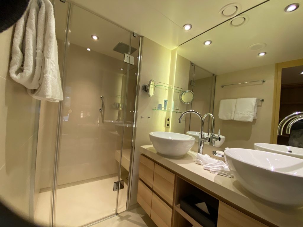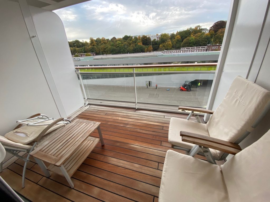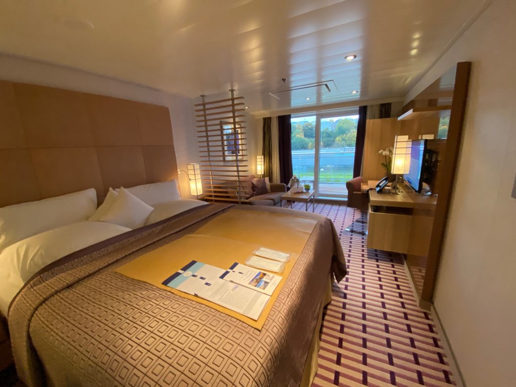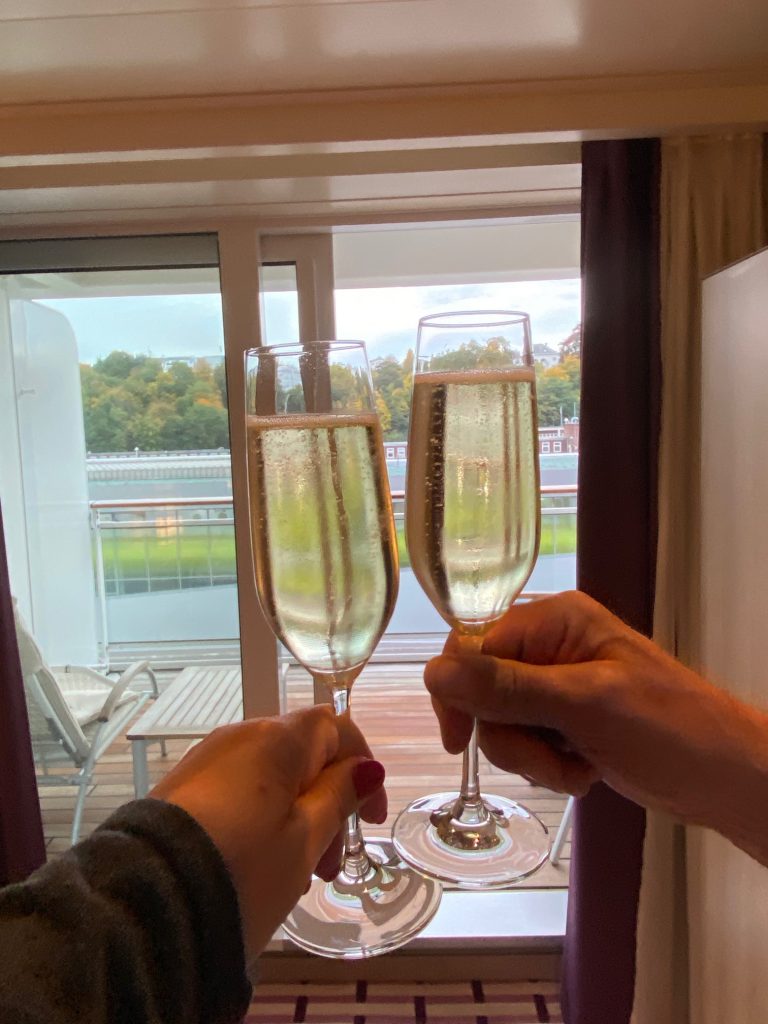 Es ging für uns direkt auf die Kabine und der erste Blick sagte uns: hier bleiben wir länger, denn es war wirklich kuschelig gemütlich. Mit ganz viel Stauraum, einem Balkon in passender Größe mit zwei Stühlen und einer Liege und dem obligatorischen Begrüßungs-Champagner, haben wir uns direkt wohlgefühlt.