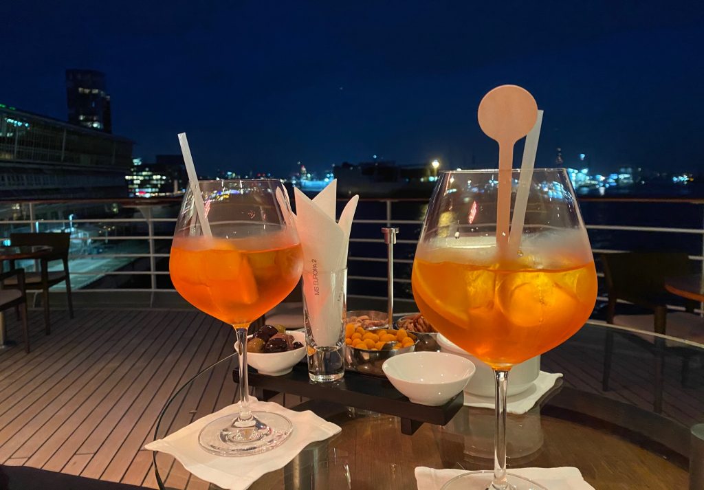 Wir machten uns – nachdem wir die Rettungswesten wieder auf die Kabine gebracht hatten – auf den Weg, um die Restaurants zu reservieren. Aufgrund des schönen Wetters beschlossen wir, draußen in der Sansibar, die Reise einzuläuten. Reserviert hatten wir in der Zwischenzeit für den ersten Abend der Reise das Restaurant ELEMENTS und für den letzten Abend das italienische Restaurant SERENISSIMA.