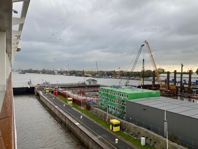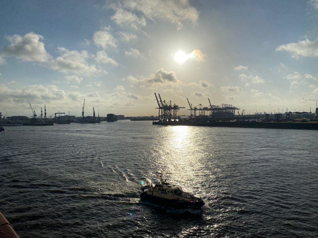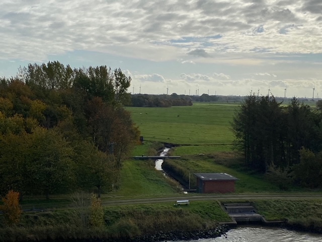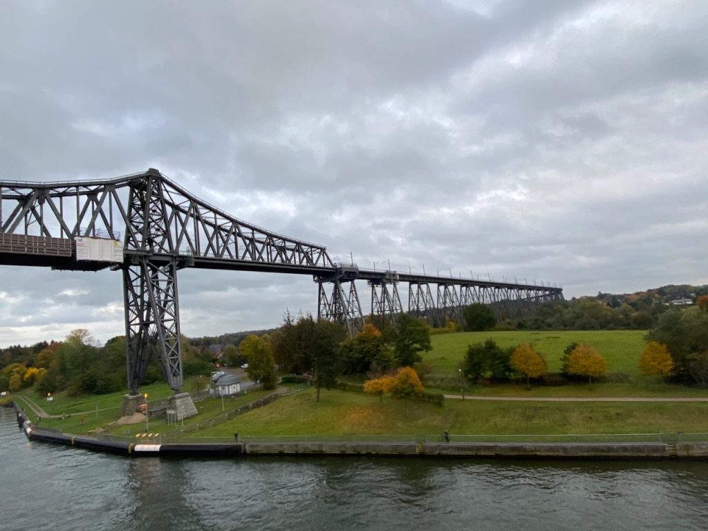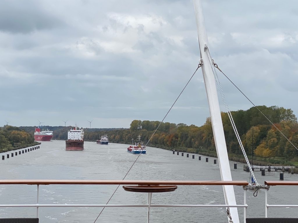 Die Tagesdestination war der Nord-Ostsee-Kanal, den wir noch nie bei einer Tagespassage aus Hamburg in Richtung Kiel befahren hatten. Das Wetter wurde mit jeder Meile besser und so hatten wir dann tatsächlich irgendwann blauen Himmel. Wir genossen unseren Balkon, machten Fotos und lauschten dem Typhon – bei jeder Fähre. Wir haben leider vergessen mitzuzählen, es war häufig – aber sehr schön.