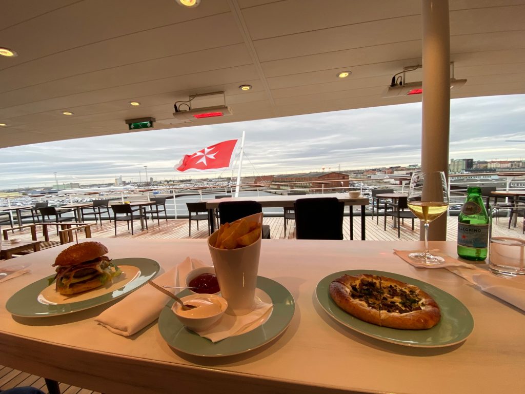 Nach einem Rundgang durch die Altstadt, sagte uns ein Blick zum Himmel, dass das nächste Schauer sicher nicht lang auf sich warten lässt. Für uns war das das Zeichen, zurück zu unserer schwimmenden Wohlfühl-Oase zu gehen. Es war gegen 14:30h als wir wieder auf dem Schiff waren. Die Mittagszeit war in allen Restaurants vorbei und entsprechend gab es nur einen Mittags-Imbiss in der Sansibar. Wir bestellten Trüffelpizza und einen Europa 2 Burger. Draußen auf der Terrasse, mit Blick auf den Hafen von Malmö zu sitzen und Mittag zu essen – entspannter könnte gerade wohl kein Platz auf der Welt sein.