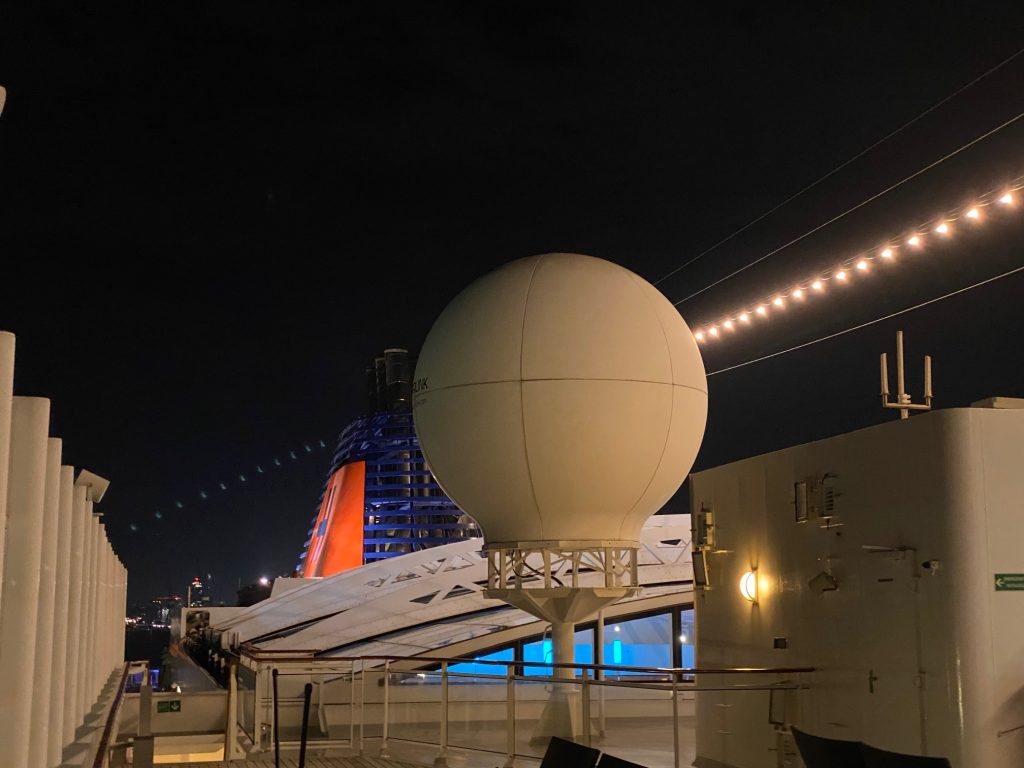 Für uns hieß es direkt von Deck 9 YACHTCLUB auf Deck 8 in die Sansibar und so saßen wir draußen und genossen die frische Brise um die Nase. Irgendwann war dann was hell Leuchtendes an der Backbord-Seite zu sehen. Wie mir der Buschfunk geflüstert hatte, sollte an dem Tag bzw. Abend AIDAperla ihren Weg zu den Kanaren antreten, um dort Anfang November ihren Dienst wieder aufzunehmen. Irgendwann waren die beiden Schiffe sich so nah, dass man wirklich mit dem bloßen Auge viel erkennen konnte, aber für ein tolles Foto, war sie schlicht zu weit weg. Etwas wehmütig war es schon.