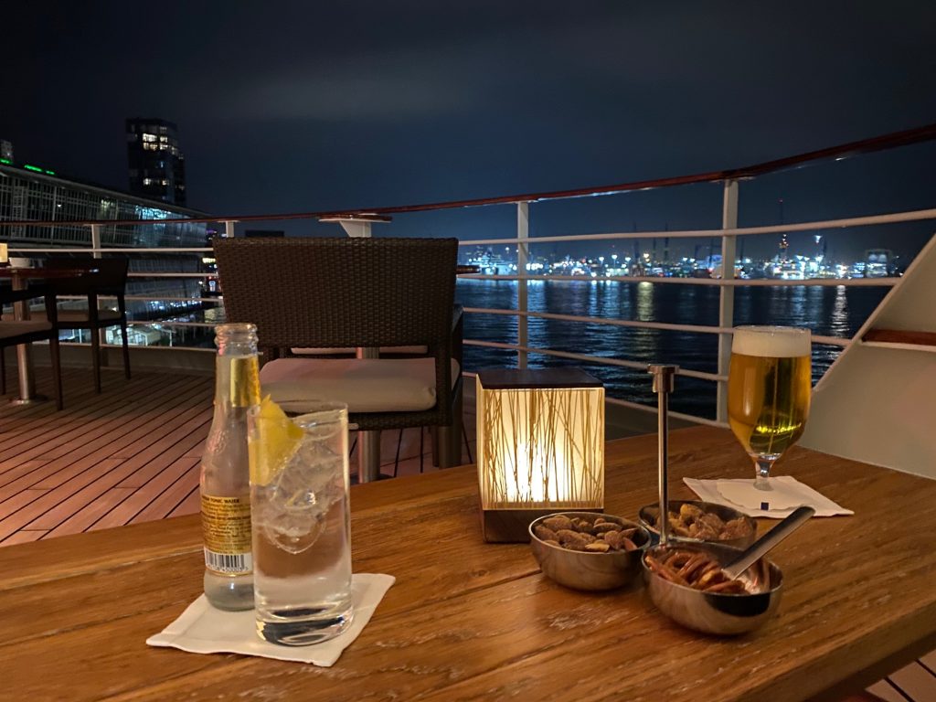 Leider waren die Vorhänge zugezogen, so dass es keinen Ausblick mehr gab. Da die Brücke direkt darüber ist, blendet das Licht der Bar die Brücke. Für uns war das aber irgendwie, wie eingesperrt zu sein und deshalb suchten wir wieder die Terrasse der Sansibar auf. Mit Heizstrahlern und Wolldecken ausgestattet, war das der „Place to be“. Auch die Cocktails waren – ob im Silberbecher oder nicht – wirklich hervorragend.