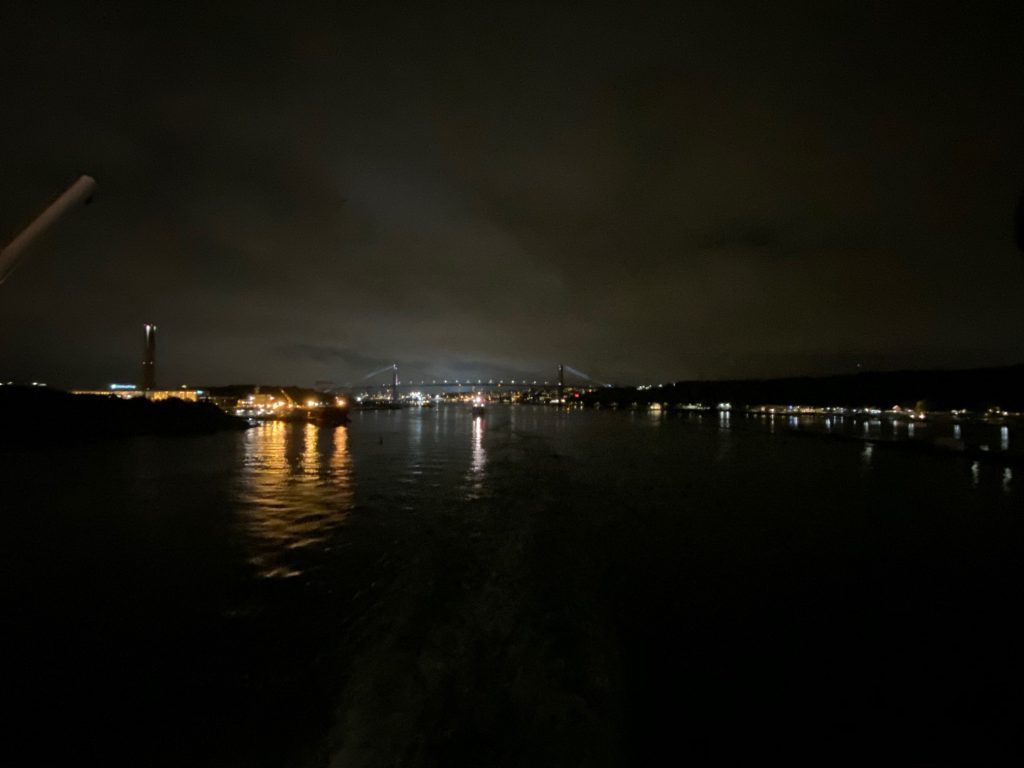 Das Auslaufen aus Göteborg stellte uns vor die Wahl: im Theater eine Hommage an Udo Jürgens anzuhören oder das Sail Away draußen mit Tänzern und Musik-Chorps aus Göteborg zu erleben? Als Udo Jürgens-Fan wäre es mir sehr schwer gefallen, zu verzichten und so sind wir dann ins Theater gegangen um auch das Farewell des Kapitäns zu erleben. Uns beiden gefiel aber sowohl der, nur kurz per Video zugeschaltete Kapitän, als auch die „Udo Jürgens Tribute Show“ nicht wirklich. Die Kapelle war leider nicht als Background zu hören , sondern war sehr dominant. Und so war die Entscheidung schon beim dritten Lied getroffen, dass es uns draußen sicher besser gefallen würde. Gesagt, getan. Raus aus dem Theater, mit dem Aufzug hoch auf Deck 10 und raus an Backbord, denn mit der Seite hatten wir morgens, bereits passend zum Auslaufen, angelegt.